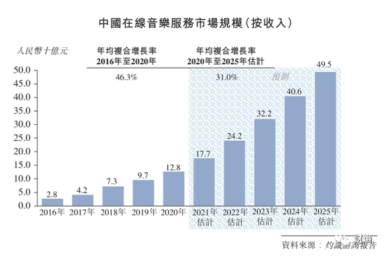 2016年中国在线音乐市场规模为28亿元;截至2020年,这一数字飙升至128亿元,年复合增速达46.3%。根据灼识咨询报告,该领域未来几年的复合增速将超过30%。
