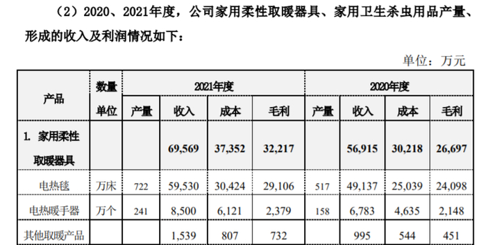 产品方面,公告显示,彩虹集团2021年电热毯销售收入为5.95亿元,占主营收入比重进一步提升,达52.47%。2020年,彩虹集团电热毯销售收入为4.91亿元,占主营收入比重为46.46%。