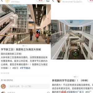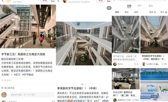 今年国庆假期刚过,不少字节跳动(以下简称:字节)的员工在社交平台晒出了新工区——位于北京大钟寺的抖音总部大楼。放眼望去,图片中是开放的中庭,整齐的扶梯,充足的公共区域与绿植。这个新工区由商场改建而来,因此也有员工戏称其为“海淀大悦城”。