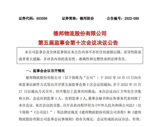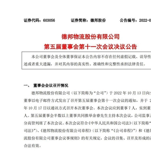 10月17日晚间,德邦股份公告,公司董事会于2022年10月17日审议并通过相关议案,同意选举余睿为公司第五届董事会董事长,选举唐伟为公司第五届董事会副董事长;监事会同意选举江卫华先生为公司第五届监事会主席。