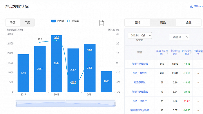 在等级医院市场,2020年至2022年上半年,布洛芬的销售量分别为22百万盒、30百万盒与20百万盒,销售额分别为438百万元、486百万元与259百万元。由于2022年全年数据暂未统计,2020年至2021年,销售量环比增长率为-18.2%与38%,销售额环比增长率分别为22.6%与11%。