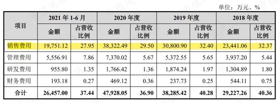 2019年至2021年,燕之屋的销售费用分别为3.08亿元、3.83亿元、4.51亿元,占营收比例为32.4%、29.5%、30.1%,三年累计超10亿元。