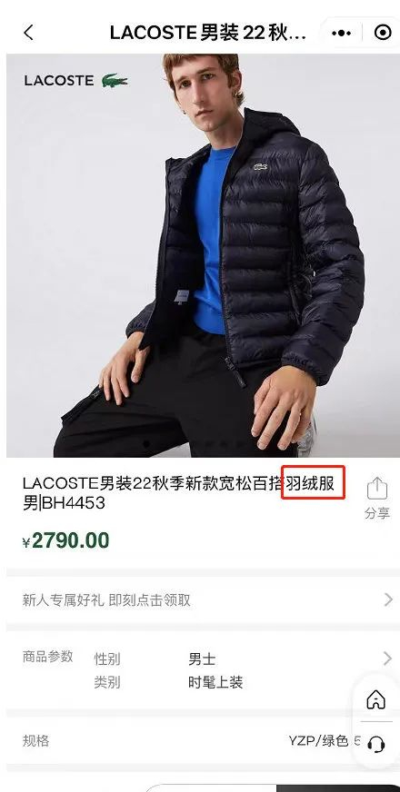 据潇湘晨报报道,据李先生介绍,因为考虑到北京天气即将变冷,他考虑购入一件羽绒服。在10月22日,他在“法国鳄鱼”LACOSTE微信小程序品牌旗舰店中看中了一件价值2790元的“LACOSTE男装22秋季新款宽松百搭羽绒服”。
