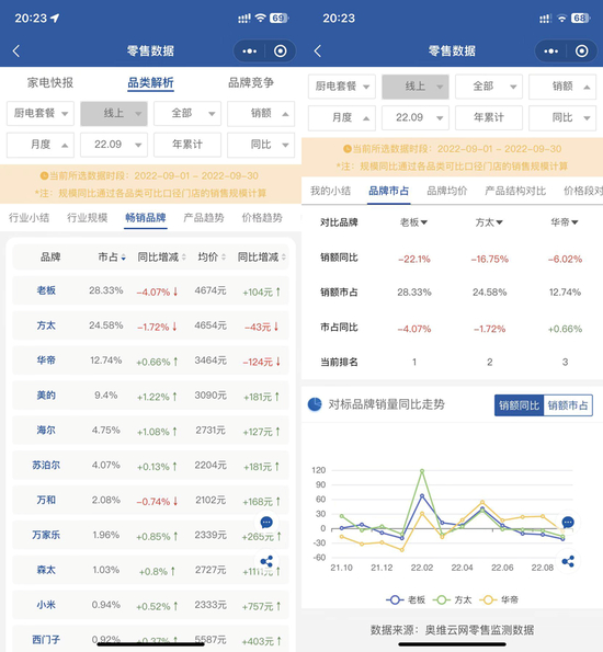 奥维罗盘数据显示,2022年9月的线上渠道,方太厨电套餐的市占率为24.58%,同比下跌1.72%,美的、海尔等传统黑白电企业的市占率稳步提升。此外,在销售额方面,2022年9月的线上渠道,方太厨电套餐也同比下跌16.75%,销售额市占率为24.58%,同比下跌1.72%。