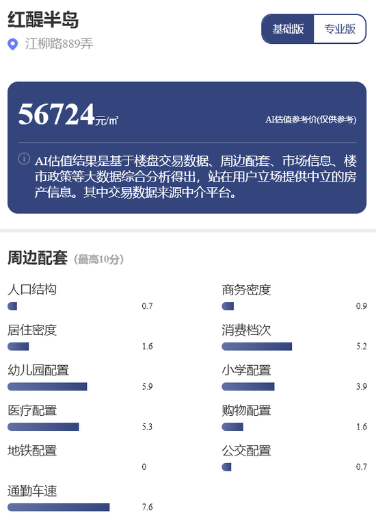 每经品房小程序显示,红醍半岛的AI估值参考价为56724元/平方米。小区周边住密度仅高于闵行区16%的住宅小区,商务密度得分也仅0.9分。周边消费餐饮客单价82元,相当于1-2线城市之间的水平,属于中档消费区域。