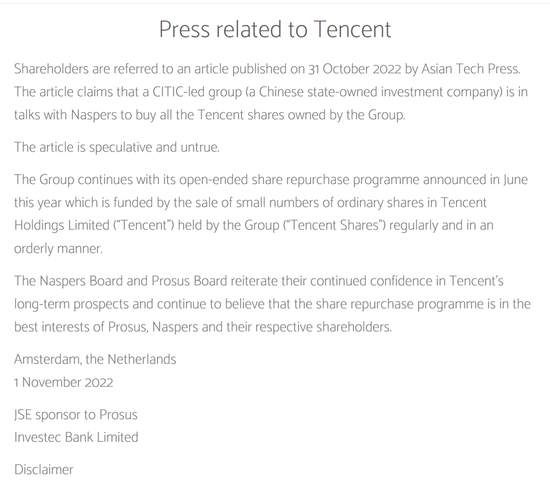 而11月1日,腾讯最大股东、南非Naspers集团荷兰子公司Prosus发布声明称,媒体公司“亚洲科技”(Asian Tech Press)10月31日文章称中信集团正组团与Naspers谈判以收购其持有的全部腾讯股份,该文是猜测性的,不符合事实。Naspers集团将继续执行今年6月宣布的开放式股票回购计划,该计划的资金来源是定期和有序地出售集团持有的少量腾讯控股的股票。