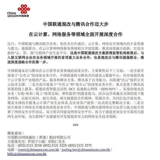 这份通告称,中国联通与腾讯联合宣布,依托各自在通信、云计算、网络安全领域内的丰富资源与能力,强强联合,在云计算和网络服务领域相互开放资源,推进深度融合创新,打造全新的“云、管、端”互联网产业生态平台。这是中国联通混改方案获得监管机构核准后,与入股互联网企业在业务领域开展的首项重大业务合作,也是混改后与腾讯强强联合、推进深度战略合作的第一步。