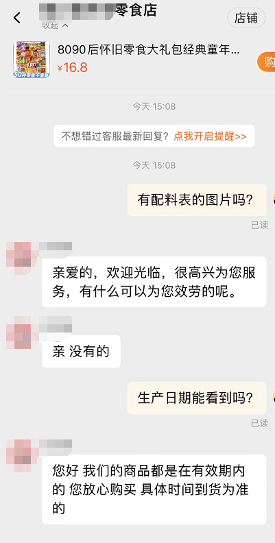 随后记者询问店铺客服是否有相关商品的配料表图片,客服表示无法提供。此外针对商品的生产日期,对方也表示要以具体到货商品为准,无法在售前提供。