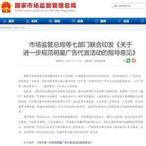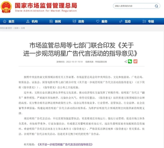 10月31日,按中宣部文娱领域治理有关工作部署,市场监管总局、中央网信办、文旅部、广电总局、银保监会、证监会、国家电影局七部门联合印发《关于进一步规范明星广告代言活动的指导意见》(以下简称《意见》),自公布之日起实施。