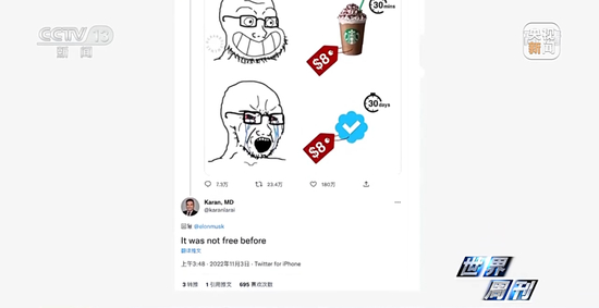 马斯克还发了一张对比漫画,8美元一杯的星巴克能喝30分钟,8美元的蓝标认证可以持续30天。