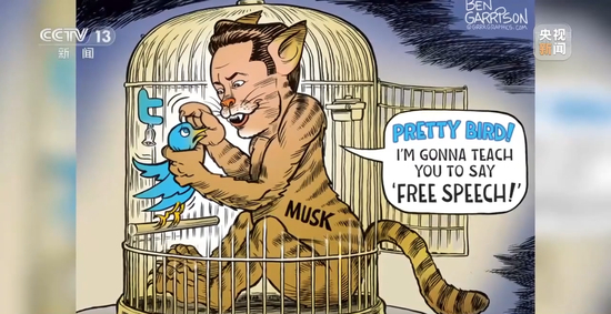 在他的笔下,马斯克被描绘成半人半猫的形象,闯进推特的鸟笼,捏着小鸟的脖子说:漂亮的鸟儿!我要教你说“言论自由”!