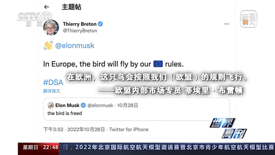 欧盟内部市场专员 蒂埃里·布雷顿:在欧洲,这只鸟会按照我们(欧盟)的规则飞行。