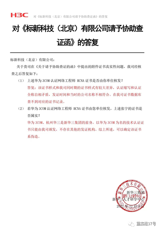 11月4日,新华三技术有限公司新华三人才研学中心出具证明称,以“华为3COM”为名的认证证书,只能由该公司颁发。经查询证书数据库,无发现对应张宁的证书记录。