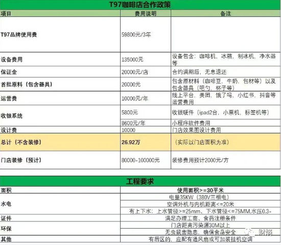 一位负责T97加盟招商的工作人员告诉财熵,加盟T97的基本费用在26万-27万元,其中包括5.98万元的品牌使用费(使用期限为3年)、1.35万元的设备费用(咖啡机、冰箱等大型设备)、2万元的保证金(合约期满后退还)、2万元的首批原材料费用、1万元/年的运营费用(美团(03690.HK)、饿了么等运营平台,广东地区具体收费标准需加盟商自己与平台商量)、5800元/年的收银系统费用、8600元/年的小程序软件费用、1万左右的设计费,总费用接近27万元。此外,加盟商需要自己承担门店租金、门店装修费用、人工成本等。