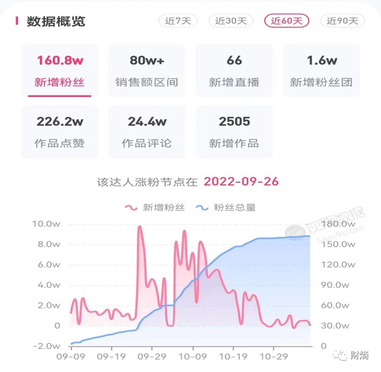 而从线上渠道看,T97从2022年4月开始首场带货直播,到9月份突然走红,观看量及粉丝量实现井喷式增长。据灰豚数据显示,近30天T97旗舰店新增粉丝数超过70万,近60天新增粉丝数超过160万,近30天场均观看人数超过600万;但成交额方面并不理想。数据显示,近30天T97旗舰店的直播销售额为10万+,近60天销售额为80万+。