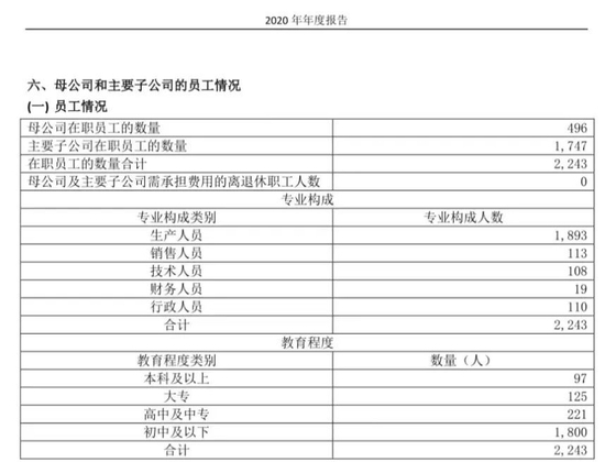 据年报数据,2020年,康隆达母公司有496人,子公司1747人,在职员工合计2243人,其中生产人员1893人,技术人员108人,初中及以下学历人员1800人。2021年,康隆达研发人员104人,占比4.58%,专科及以下学历人员78人。