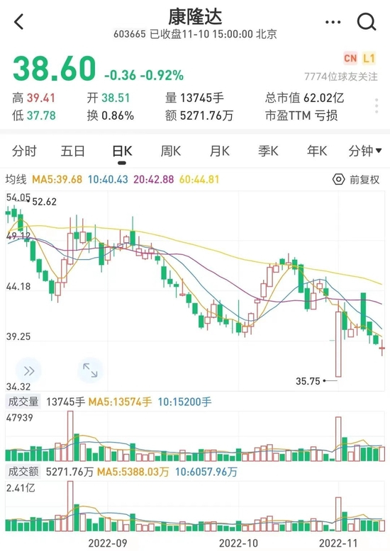 截至三季度末,康隆达股东数6023户。11月10日收盘,其股价报38.6元/股,继跌停后变幅不大。不过从去年9月创下11元/股低点算,康隆达股价涨幅已有250%。