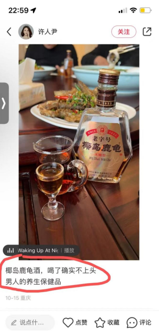 新浪财经检索发现,椰岛鹿龟酒的官方宣传中仅有抗疲劳、免疫调节等保健功效的宣传,并未有明显不合规的行为。然而,社交媒体上,有关鹿龟酒的评价充斥着“拯救性冷淡”、“男人的养生保健品”等擦边类信息。