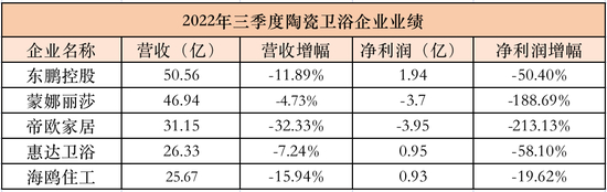 而从业绩角度来看,乐居财经《家居k线》曾对部分陶瓷卫浴上市公司2022年上半年业绩进行总结,5家企业均是营收、净利润双双下滑,其中营收跌幅最高的帝欧家居,同比下滑比例接近4成;而净利率跌幅最高的蒙娜丽莎,同比暴跌273.09%至净亏损4.88亿元,令人咂舌。
