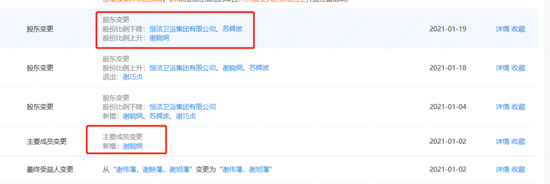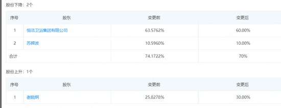 乐居财经《家居K线》从企查查获悉,谢晓炯以监事的身份在2021年1月2日进入广东恒洁卫浴有限公司,并从恒洁卫浴集团、苏舜波手中分得月4.17%的股份,从原有的约25.83%升至现有的30%,其中恒洁卫浴集团让出了约3.58%,苏舜波分出去0.6%。