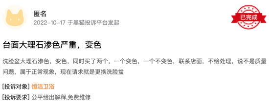 如今,在某知名的消费者投诉平台上,有关恒洁卫浴的产品投诉也时有发生。2022年10月17日,某匿名用户投诉称购买的恒洁卫浴洗脸盆大理石出现渗色,变色的问题,联系了恒洁店面,他们不给处理。
