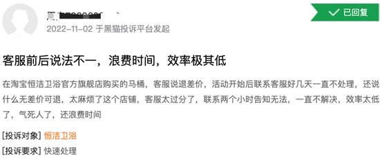 另有用户于11月2日投诉称,在淘宝恒洁卫浴官方旗舰店购买了马桶,客服说退差价后续却前后说法不一,迟迟不给回复。