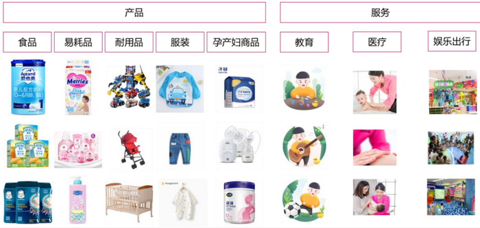 孩子王主营业务属于母婴赛道。依据商品形态的不同,母婴业务可分为“商品”和“服务”两大板块,其中,商品主要包括食品(奶粉、婴儿辅食等)、易耗品(纸尿裤、洗护用品等)、耐用品(玩具、婴儿车床)、服装和孕产妇商品等;服务则涵盖教育、医疗、娱乐出行等多个方面。