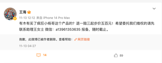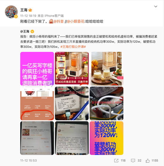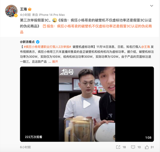 11月14日,王海再发布微博,表示“小杨哥”卖的破壁机不仅虚标功率还是假冒3C认证的伪劣商品。