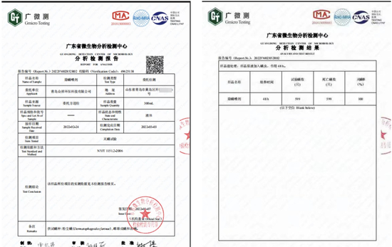 “YX益鑫百货”客服给出的检验报告首页显示,检验样品为“除螨喷剂”,委托单位为“青岛众祥环保科技有限公司”(以下简称“青岛众祥”),检验项目为灭螨实验,检测结果为灭螨率100%。