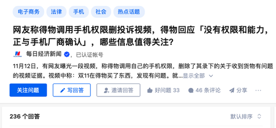 “如何看待得物app未经用户允许调用权限后台删除手机视频?”这个问题,已经有15万的浏览量和20个回答。