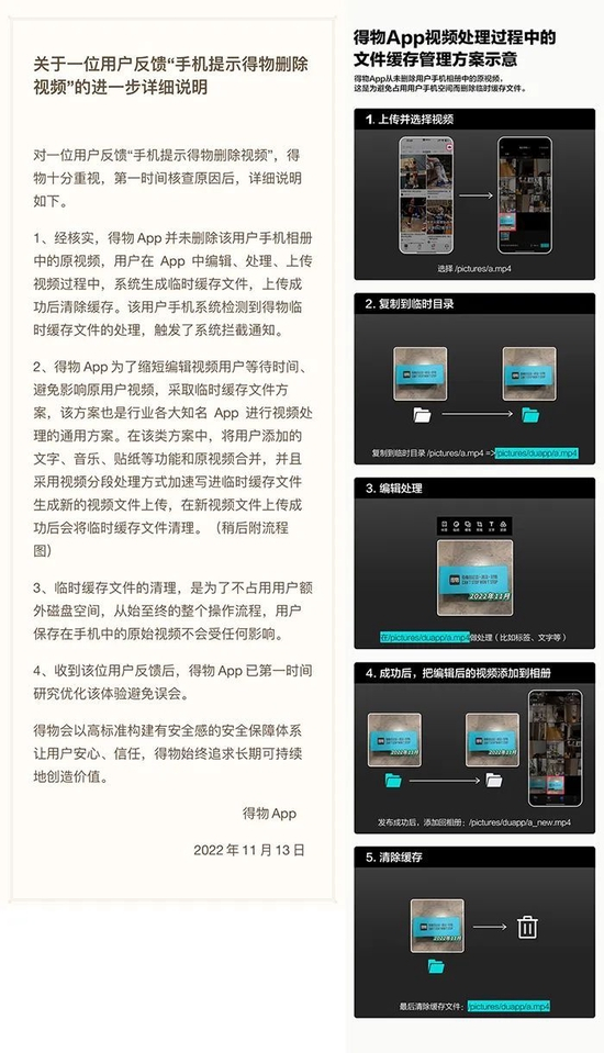 “得物完全没有任何动力去做删除用户相册等不合规点行为。同时,对于用户海量视频内容,得物没有相应技术能力进行批量识别,甚至定向删除。”这是第一份声明中的核心信息。