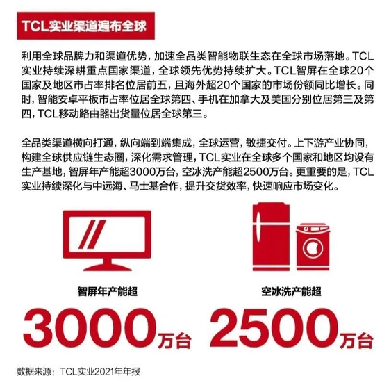 数据显示,TCL通过TCL科技与TCL实业两大主体在全球范围内建立了完善的供应链体系,业务遍及亚、美、欧、拉美及大洋洲,在全球各地设有43个研发中心、32个制造基地,销售机构遍布80多个国家和地区,业务范围超过160个国家和地 区。