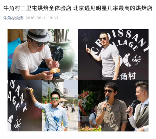 公开资料显示,北京牛角村餐饮管理有限公司成立于2015年,股东中包括明星杨坤、吴秀波和夏雨,2016年在北京三里屯通盈中心开设第一家“牛角村”烘焙门店,主打牛角包相关烘焙产品。