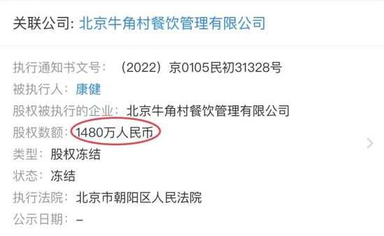 北京商报记者从天眼查看到,北京牛角村餐饮管理有限公司被市场监管部门列入经营异常名录,公司董事长康健所持有的股权目前已被冻结。同时,公司法定代表人黄芳所担任法人的公司也被限制高消费,该公司正是上述公司的子公司。