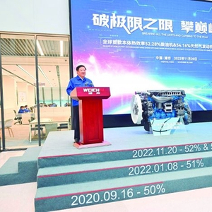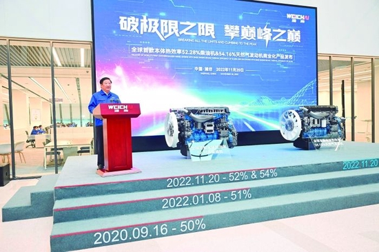 2022年11月20日下午,潍柴发布全球首款本体热效率52.28%商业化柴油机和全球首款本体热效率54.16%商业化天然气发动机。中国工程院院长李晓红,中国工程院副院长钟志华,中国工程院副院长邓秀新,中国工程院院士凌文等参加新品发布活动。发布活动上,李晓红、凌文分别作了祝贺讲话。