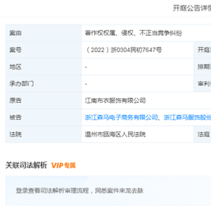 浙江省温州市瓯海区人民法院开庭公告显示,江南布衣森马服饰于11月22日对簿公堂,案由为著作权权属、侵权、不正当竞争纠纷。