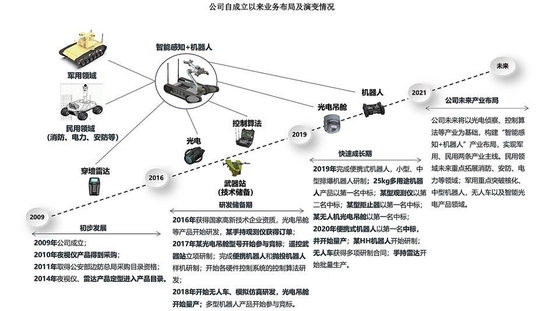 据招股书显示,公司主要业务目前集中于光电侦察设备和军用机器人两大核心领域,能够为客户提供整机、分系统或组件产品。光电侦察设备业务主要包括无人机光电吊舱、手持光电侦察设备、单兵夜视镜、手持穿墙雷达、光电压制/对抗产品等;机器人系统业务主要包括侦察机器人、多用途机器人、排爆机器人、军用无人车(重量大于1,000kg的地面机器人分类为无人车)、其他类型机器人及机器人组件/部件等。