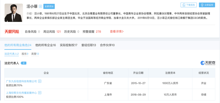 天眼查显示,目前汪小菲名下有16家关联公司,对17家公司有实际控制权,存续开业状态的有12家,版图涉及餐饮、科技、影视等。其中,汪小菲担任法定代表人的企业有2家,分别为广东九份信息科技有限公司、上海珍熙文化传播发展中心。