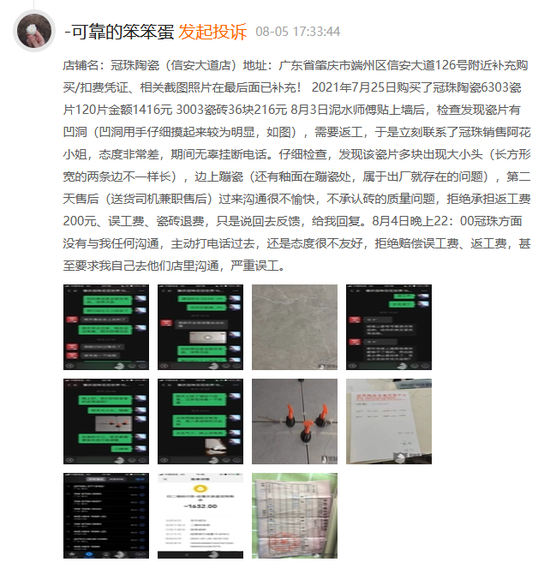 但郑州丁先生在铺贴完地砖后却高兴不起来,他无法接受,冠珠作为一个知名瓷砖品牌,会出现产品缺陷问题,售后处理更是让他无可奈何。