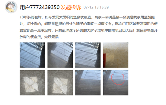 除了地砖不平整的问题,该投诉平台上也有消费者曾投诉冠珠瓷砖出现凹洞、发乌等质量问题。