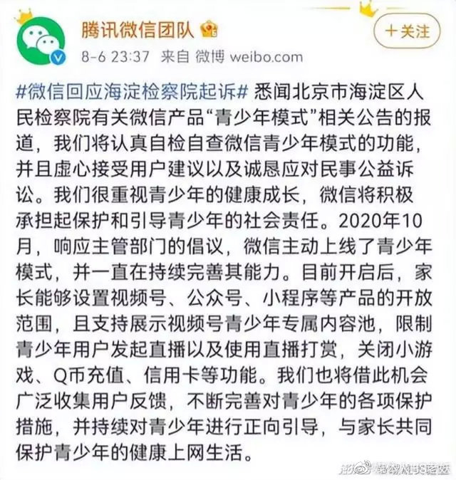 随后,北京市海淀区检察院针对该问题发起公益诉讼,称微信产品“青少年模式”不符合《中华人民共和国未成年人保护法》相关规定,侵犯未成年人合法权益,涉及公共利益。
