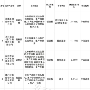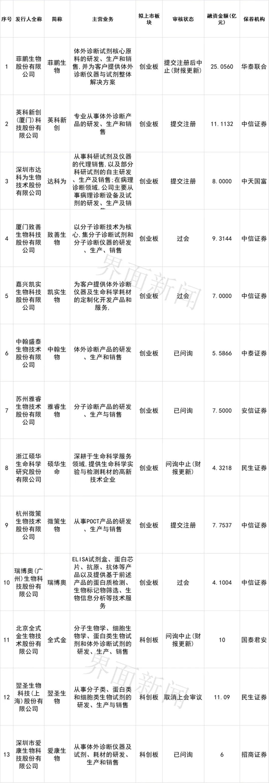 据界面新闻记者不完全统计,目前沪深北交所涉及新冠核酸检测业务的IPO公司共计13家,具体名单如下: