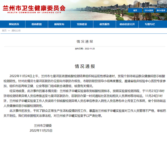 11月25日,兰州市卫健委发布情况通报:11月24日上午,兰州市七里河区依据核酸检测结果组织转运阳性感染者时,发现个别待转运群众健康码显示核酸检测阴性。