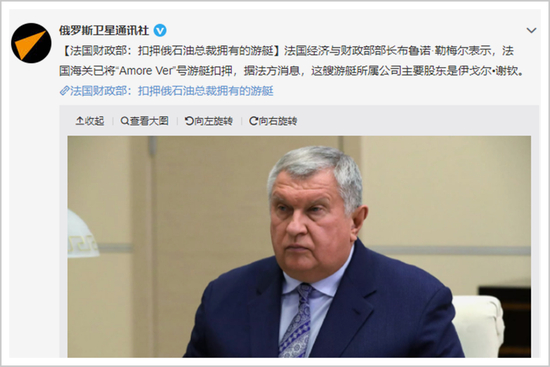 3月3日,法国政府没收了俄罗斯石油公司总裁、前俄罗斯副总理伊戈尔·谢钦的巨型游艇“真爱号”。当时,这艘价值1200万美元的游艇正在造船厂维修。