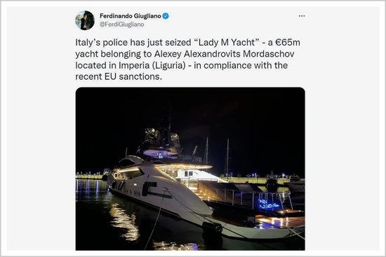 战争刚发生不久,莫尔达绍夫的另一艘豪华游艇“Lady M”就在意大利港口城市因佩里亚被扣押,一同失去的还有他在撒丁岛上,价值1.16亿美元的豪华别墅。