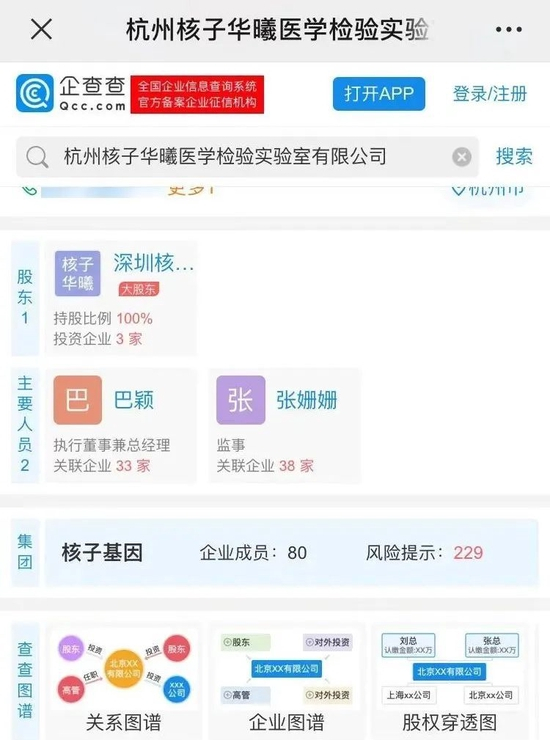 于是,比朝阳区居民更厉害的网民顺藤摸瓜,挖出以张珊珊为监事的38家公司,基本都与核酸检测业务相关,而这些公司背后的唯一大股东都是深圳市核子基因科技有限公司,实际控制人为张核子,张珊珊是其女儿。