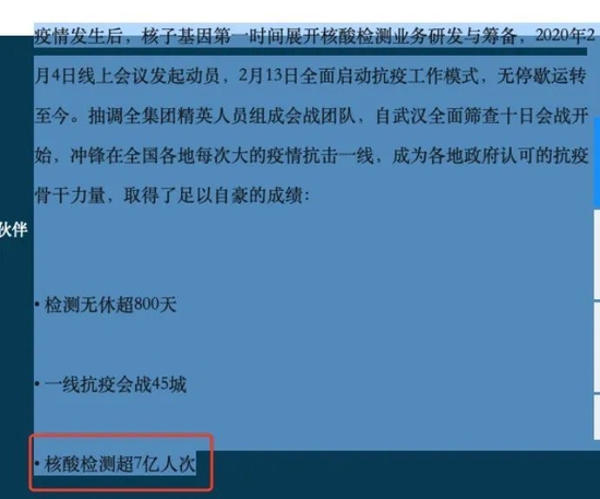 而该公号今年5月的一篇文章中,则提到核子基因已承担了4亿人的核酸检测。