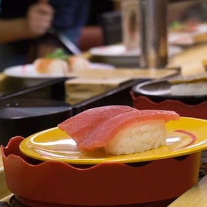 而且价格亲民,“人均60吃到饱”。自助旋转台上的产品价格以碟子颜色区分,粉色碟每个6元,花色碟每个18元,另外,也可以菜单点菜。SKU在80个左右,分为五大品类:寿司、刺身、小菜、甜点、饮料等。除了线下堂食,还提供外带简餐。