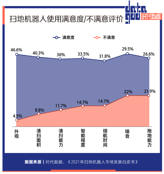 在外观、清扫面积、智能程度、续航时间、清扫能力、拖地能力和噪音 7 个维度,满意度最高的是外观,拖地能力满意度垫底。