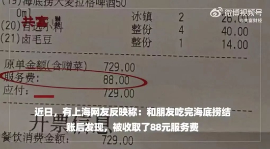 据媒体报道,近日,有网友爆料称,其在海底捞和朋友聚餐,饭后结账时才发现,被额外收取了88元的服务费,觉得不太合理。对此,海底捞服务人员回应称,该88元的服务费为包间服务费,收取的原因是因为包间的设施比大厅好,而且会安排专门的人员提供服务。